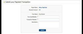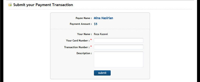 گزینه submit your payment را انتخاب کرده و فرم را پر کنید. در قسمت your card number شماره کارت خودتان و در قسمت Transaction number شماره رسید پرداختی (شماره بازیابی روی فیش عابر بانک) را وارد کنید.