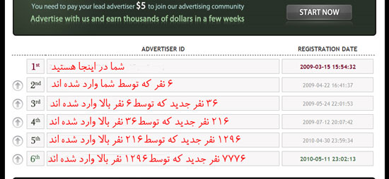 حالا 7776 نفر فرمی را دارند که شما در آن نفر اول و lead advertiser هستید این افراد هر کدام این فرم را برای 6 نفر می فرستند تا کارشان را شروع کنند